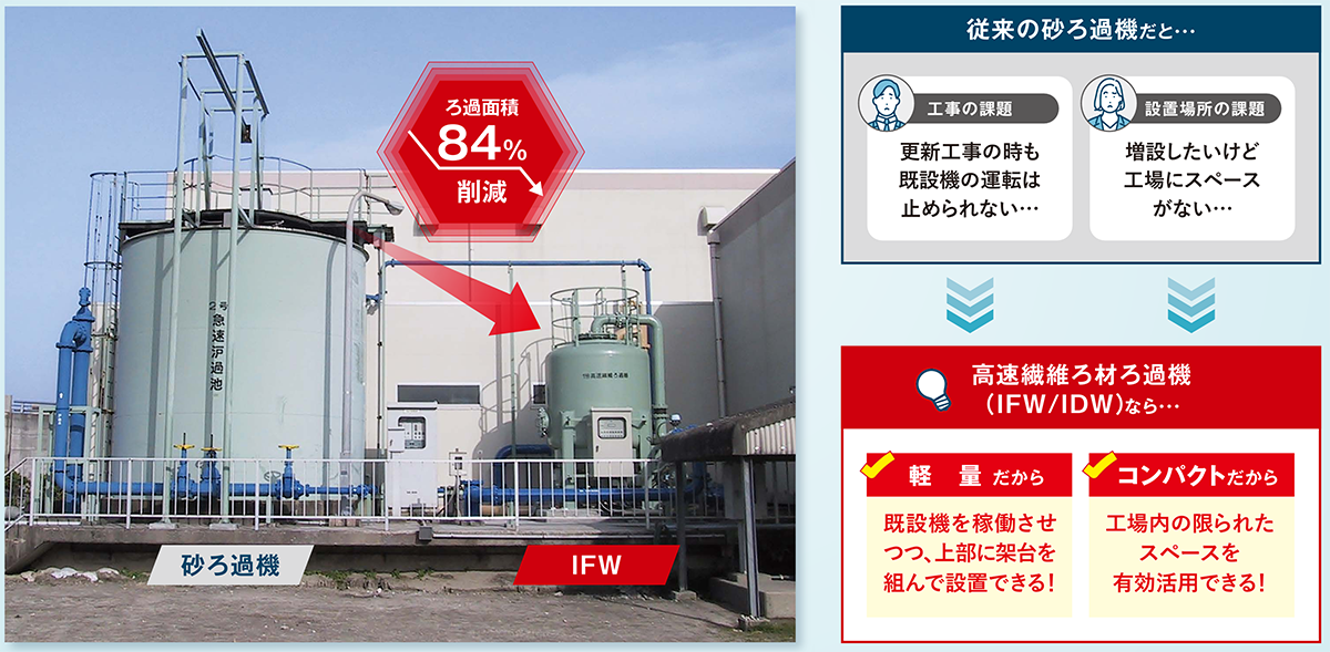 「工場の増産で水処理能力を上げたいが、敷地がない」。そんな現場でも、既存の砂ろ過槽を撤去したスペースにIDW-MFを置けば、お釣りが来るほどの余裕が生まれる。また、重量も軽いため、今まで設置不可能だった地下水槽上部に設置できる可能性もある。