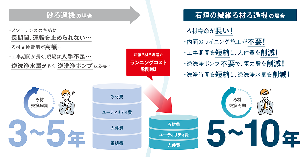 「ろ材はポリエステル製で耐久性が高く、交換周期は10年と、砂ろ過(3〜5年)と比較しても長寿命です。トータルのランニングコストとメンテナンスの手間は、既存技術と比較しても圧倒的に有利です」。